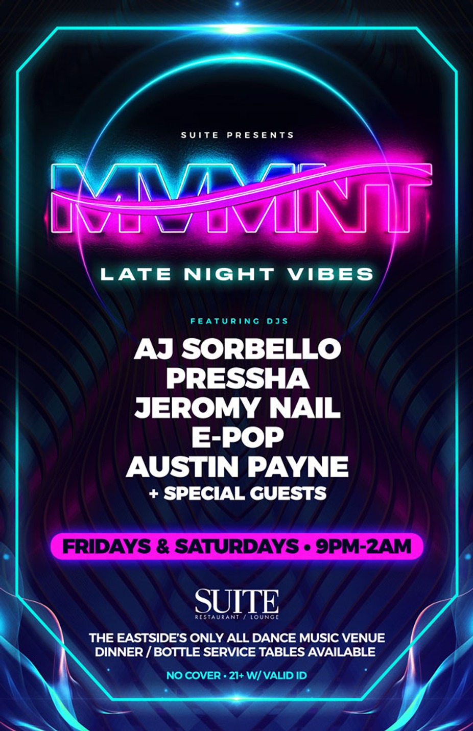 MVMNT Late Night Vibes featuring Suite resident DJ's and guests spinning open format dance music, guaranteed to make you want to dance the night away.